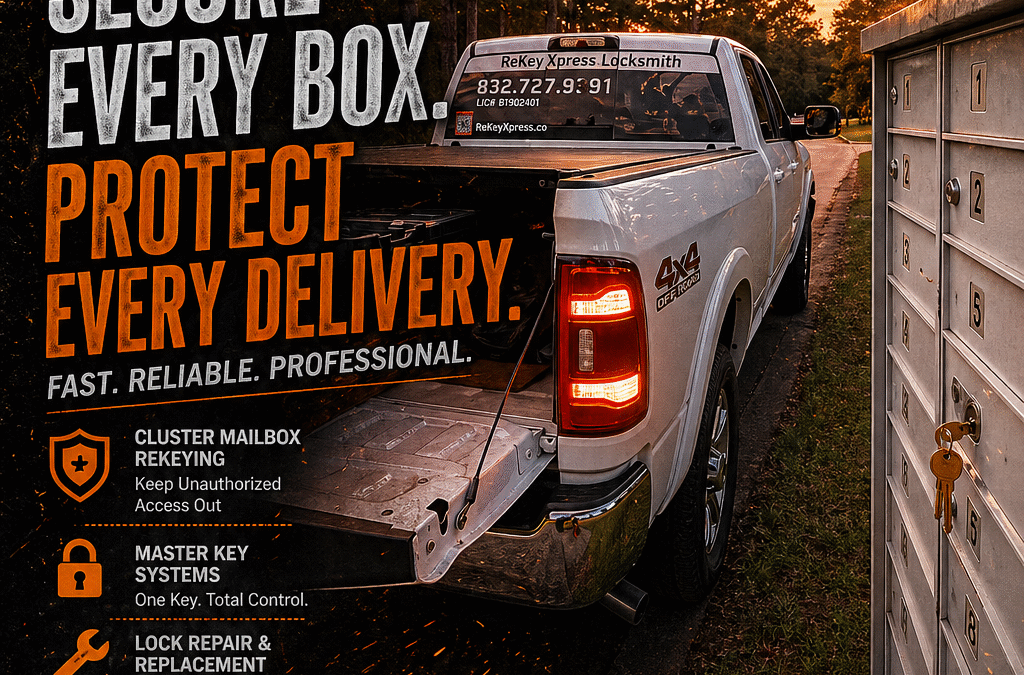 From stubborn mailbox locks to full cluster box repairs — ReKey Xpress Locksmith (Lic B18820) is your trusted local Conroe locksmith for fast, reliable postal hardware solutions.
