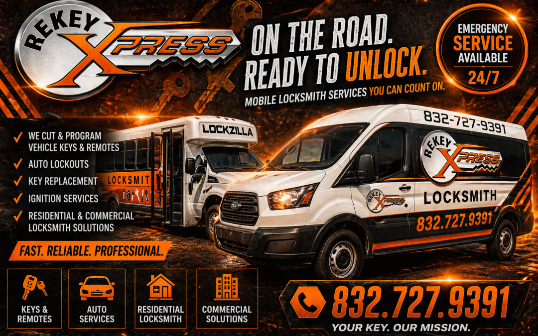 Whether you’re locked out of your vehicle or need new keys programmed, trust ReKey Xpress Locksmith (Lic B18820), your local Conroe locksmith and River Plantation locksmith for fast, on-site automotive service.